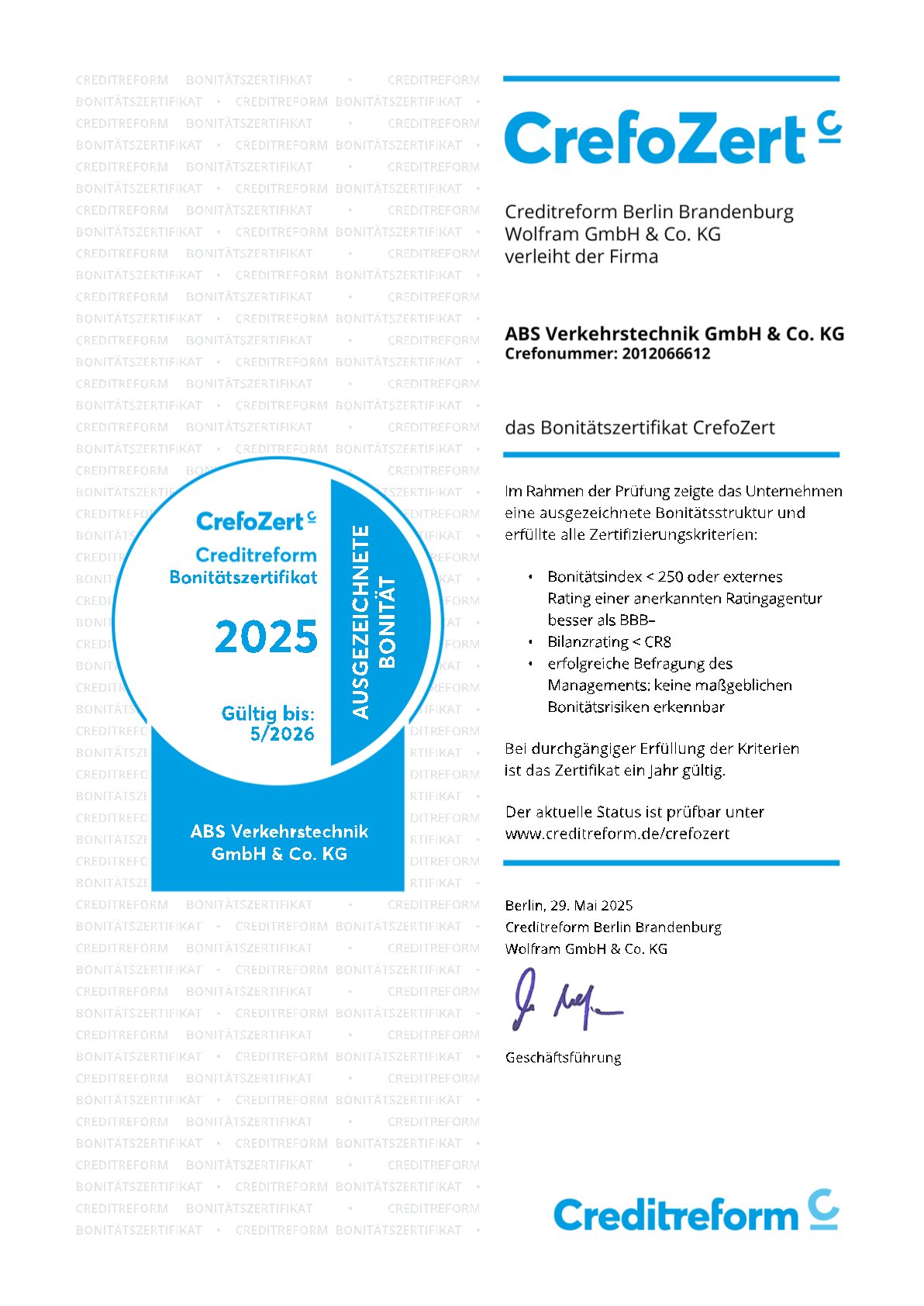 Das CrefoZert erhalten nur Unternehmen mit einer nachweislich soliden Bonitätsstruktur – für unsere Kunden und Geschäftspartner ein verlässliches Zeichen von Sicherheit und Kontinuität.